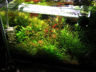 | Altwasser Nano Größe: 12L Licht: 24Watt (1x11W +1x 13W G23) [965 Vollspektrum + 6000k 3Banden) Co2 per Flipper Ada Africana soil PH 4,5 - 5,5 Kh0 Düngung: TMG+ (später All-in-one) Besatz: kleine Gyraulus Tellerschnecken, Hüpferlinge, Grüne Hydras  |