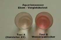 an (0,05-0,1mg/L) als im Aquarium tatsächlich da ist. Test B - dasgleiche Aquarienwasser diesmal aber mit dem Wasserpantscher Eisentest sensitiv getestet und man sieht schon am wesentlich kräftigeren Farbumschlag, das das Ergebniss ein gänzlich anderes ist. (ca. 0,3mg/L)  |